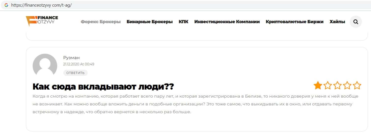 - Отзывы интернет пользователей о финансовых жуликах T-AG Org
