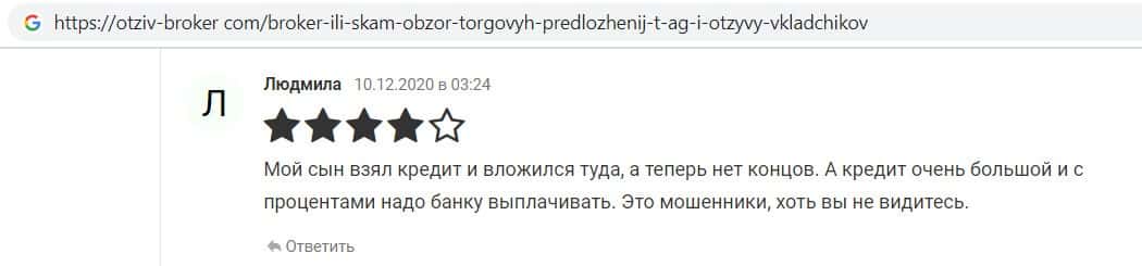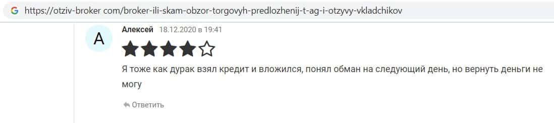 А вот данный пользователь написал как его развела фирма Т АГ. Он сообщил, что компания заставляет клиентов взять кредит, а после чего просто требует дополнительные средства.