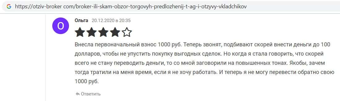 Автор данного написал, что сотрудничал с Т АГ и инвестировал 1000 рублей, после чего сотрудники лохотрона начали требовать больше и отказались выводить средства клиента.