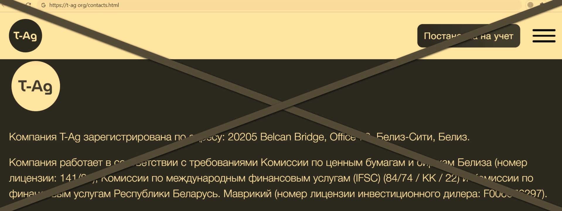 Финансовые махинаторы T-AG Org на своём сайте указали, что являются лицензированным брокером, но нет никаких доказательств того, что фирма имеет хоть какую-нибудь лицензию.