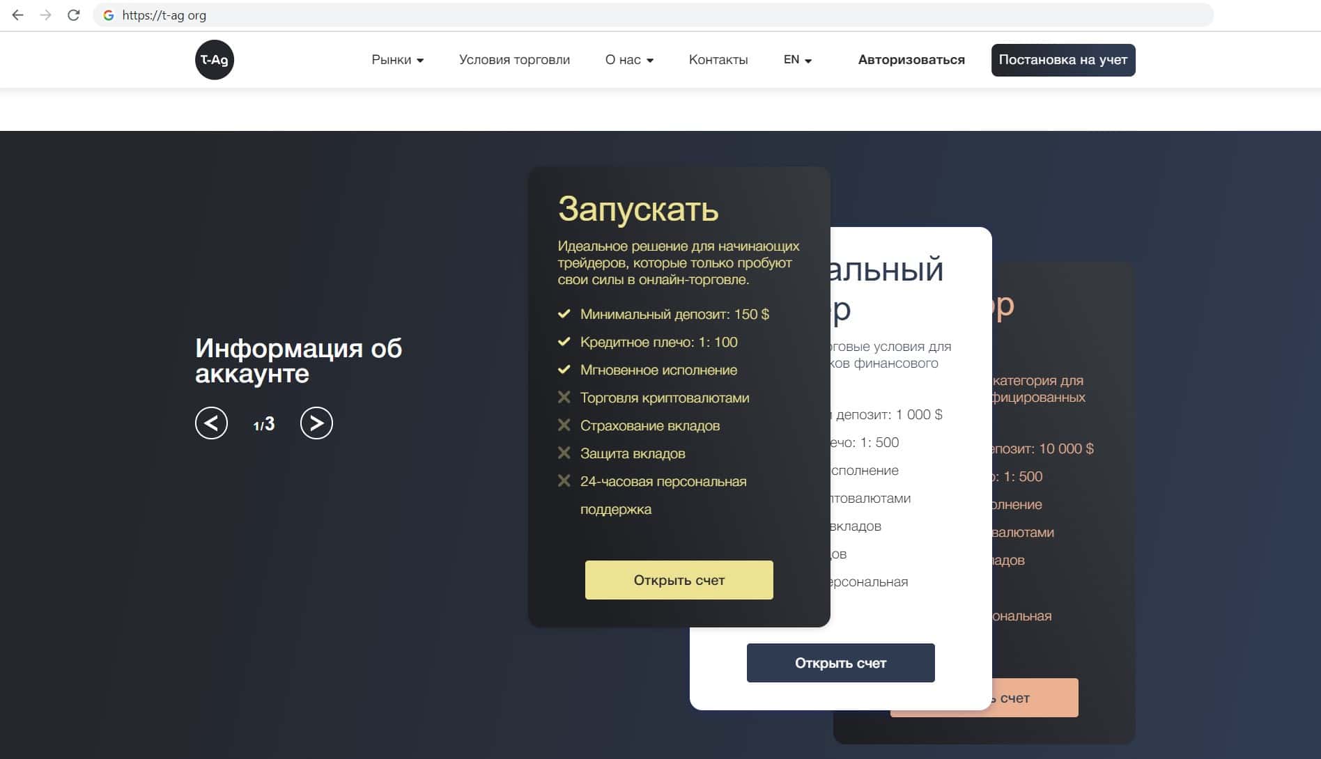 Псевдоброкер T-AG Org представил пользователям три типа счетов, которые отличаются между собой услугами и депозитом, который варьируется от 150 до 10000 долларов.