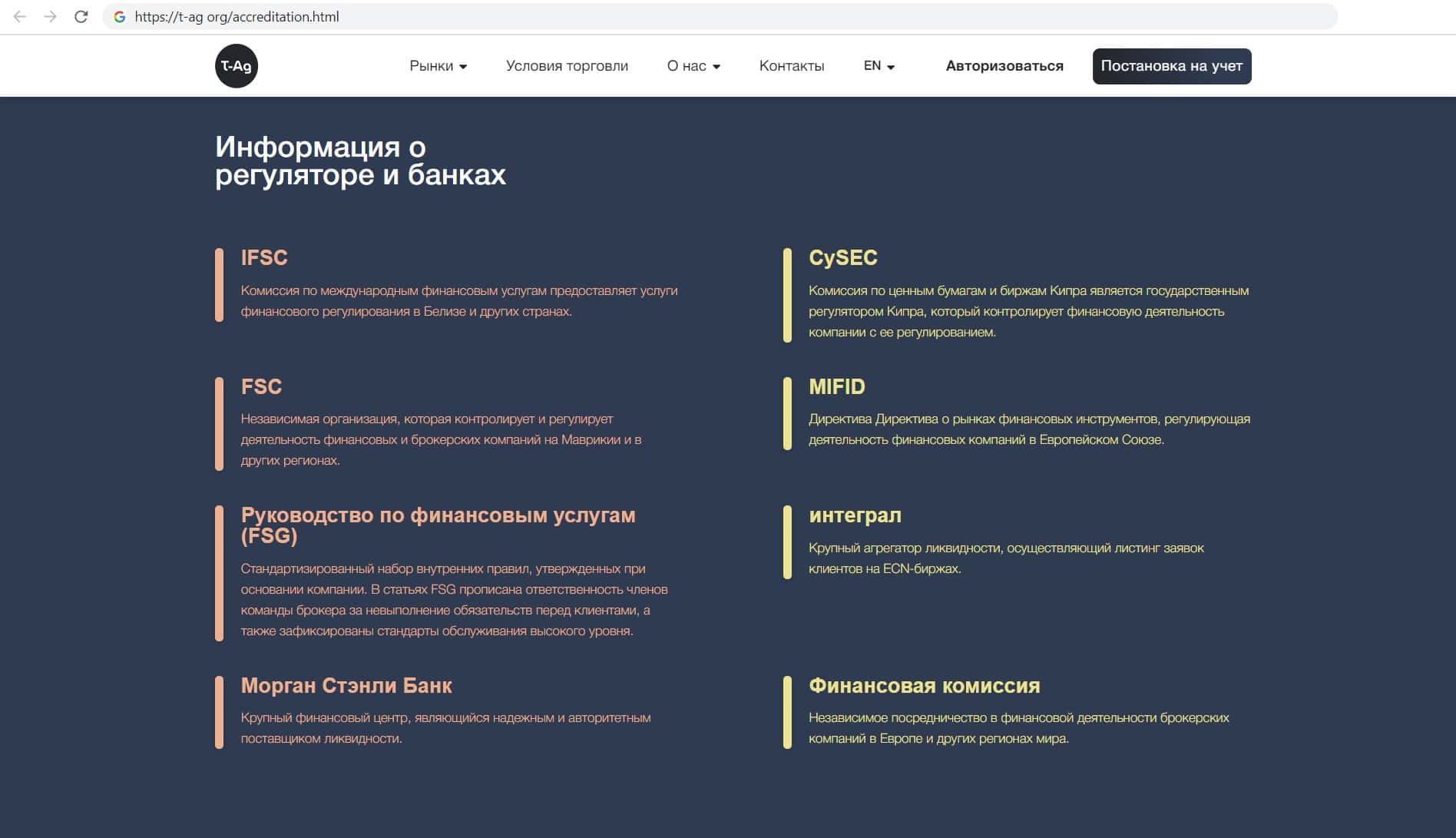 На своём сайте мошенники T-AG Org указали, что имеют несколько регуляторов, но вот только большинство из них это известные жулики: CySEC, FSC, Integral Com и IFSC.