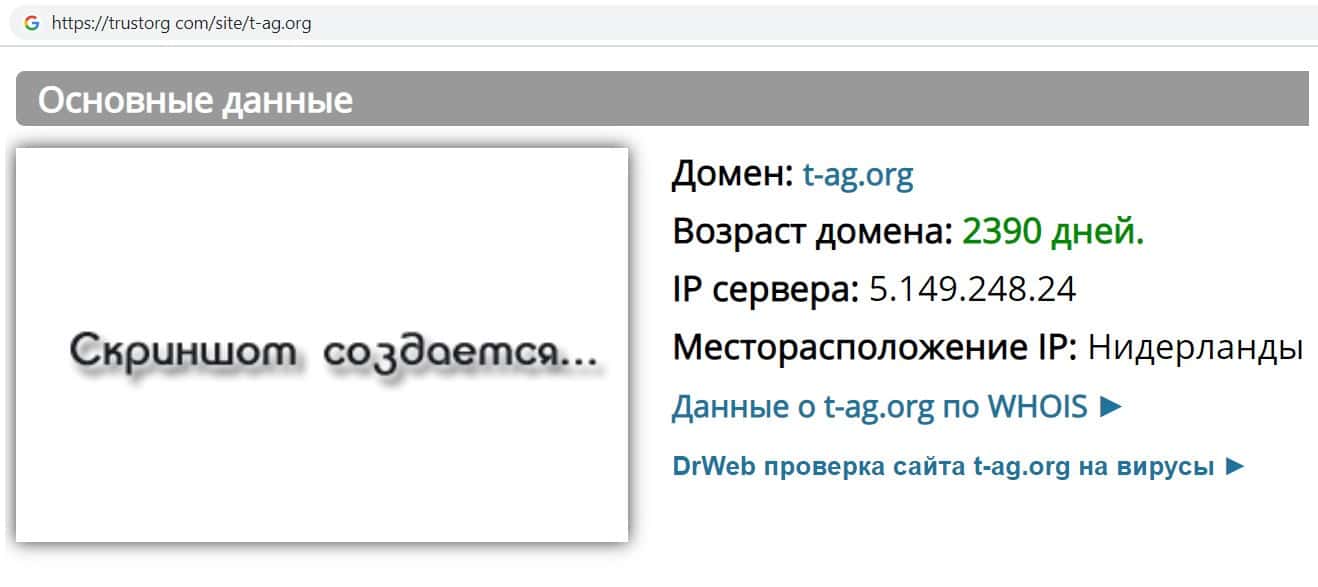 Через сайт "Доверие в Сети" мы узнали, что сайту кидал T-AG Org более 6 лет, но есть информация о том, что мошенники купили свой домен, что бы врать о своём возрасте.