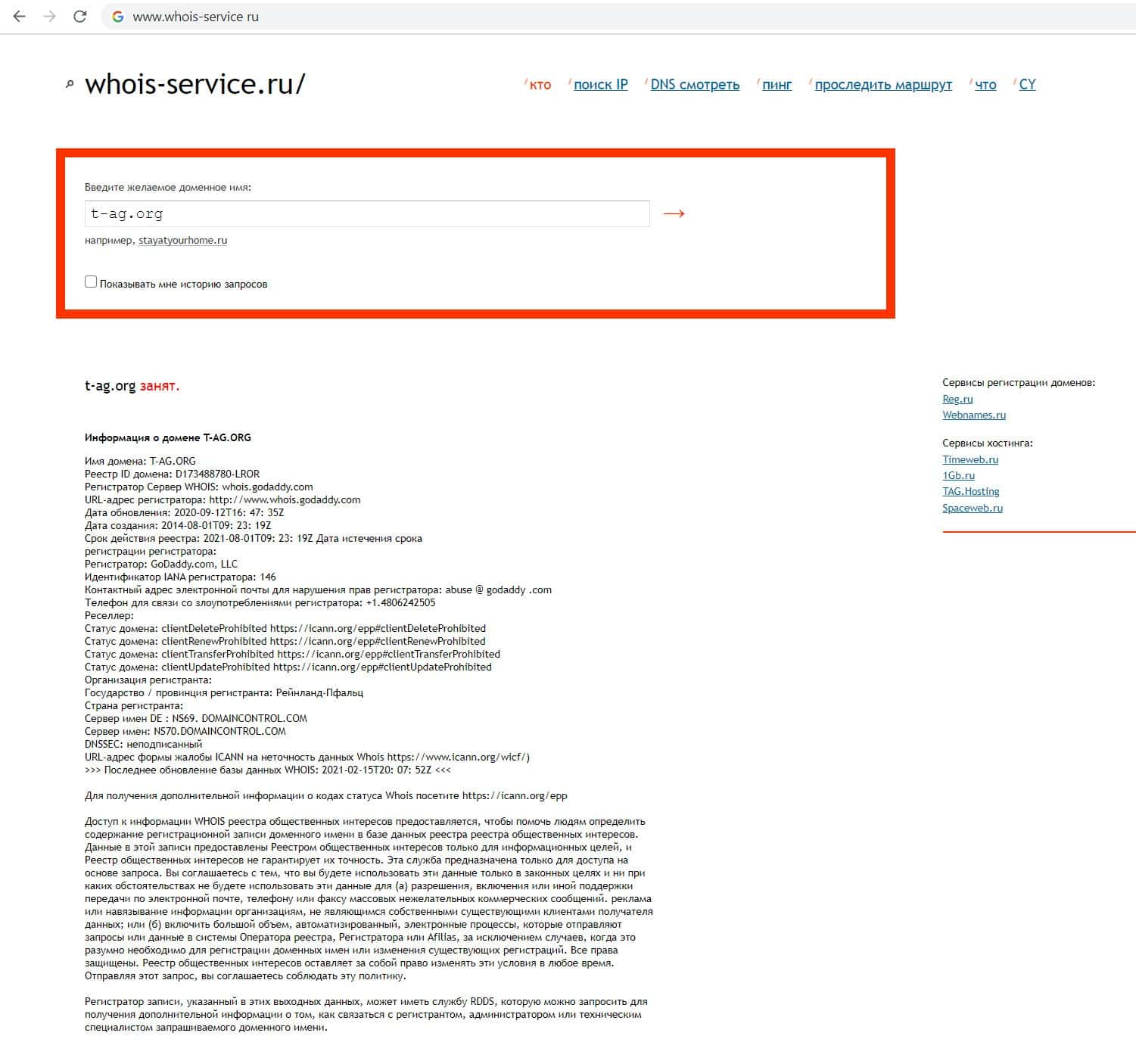 Мы использовали интернет ресурс whois-service ru для того что бы узнать владельца домена Т АГ. Оказалось, что компания разводит скрывает данную информацию.