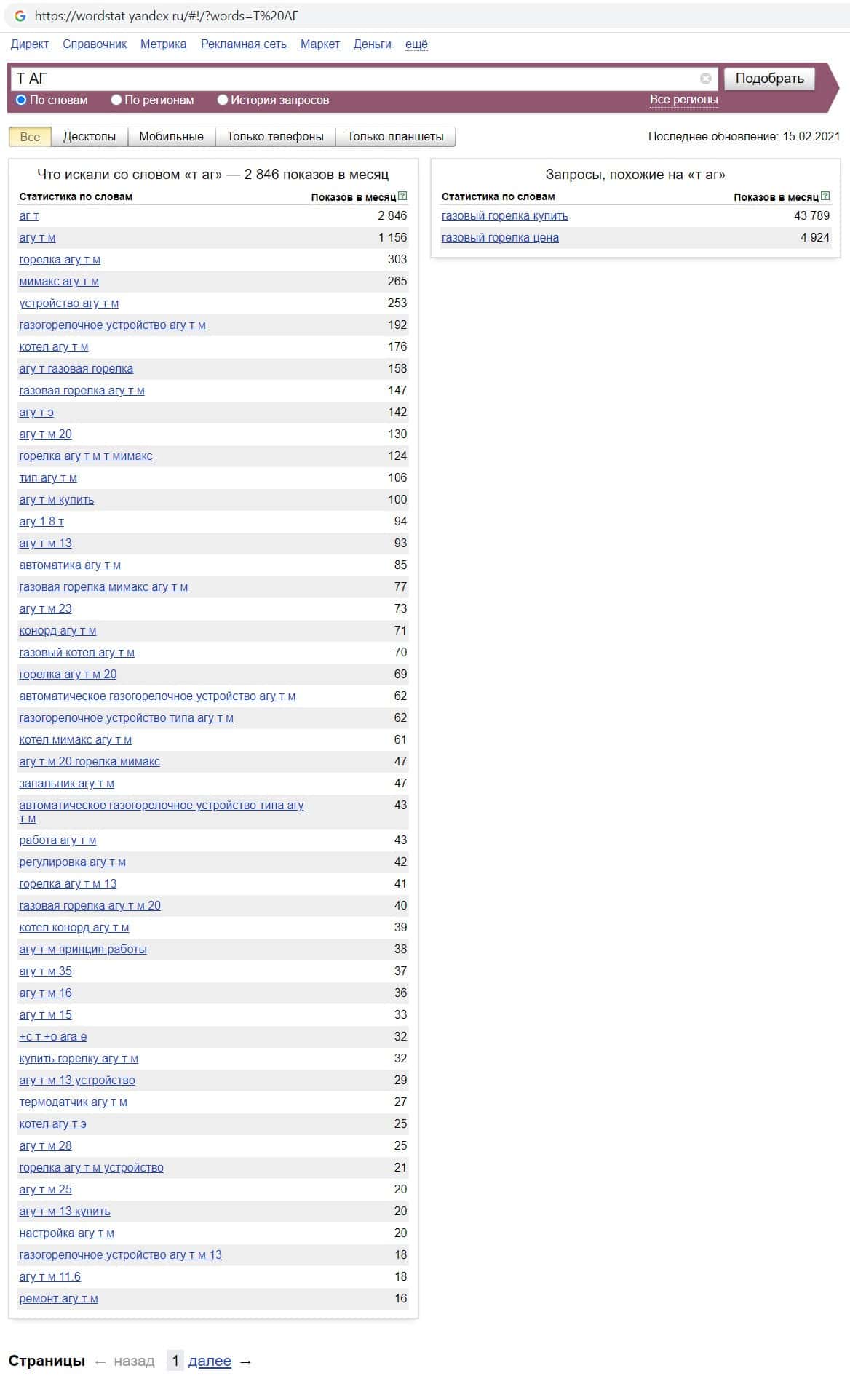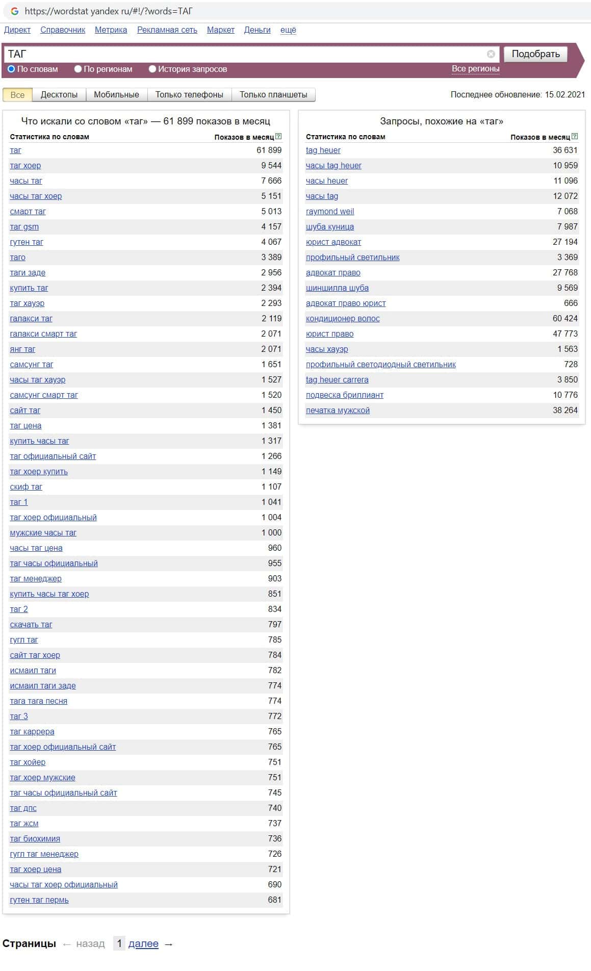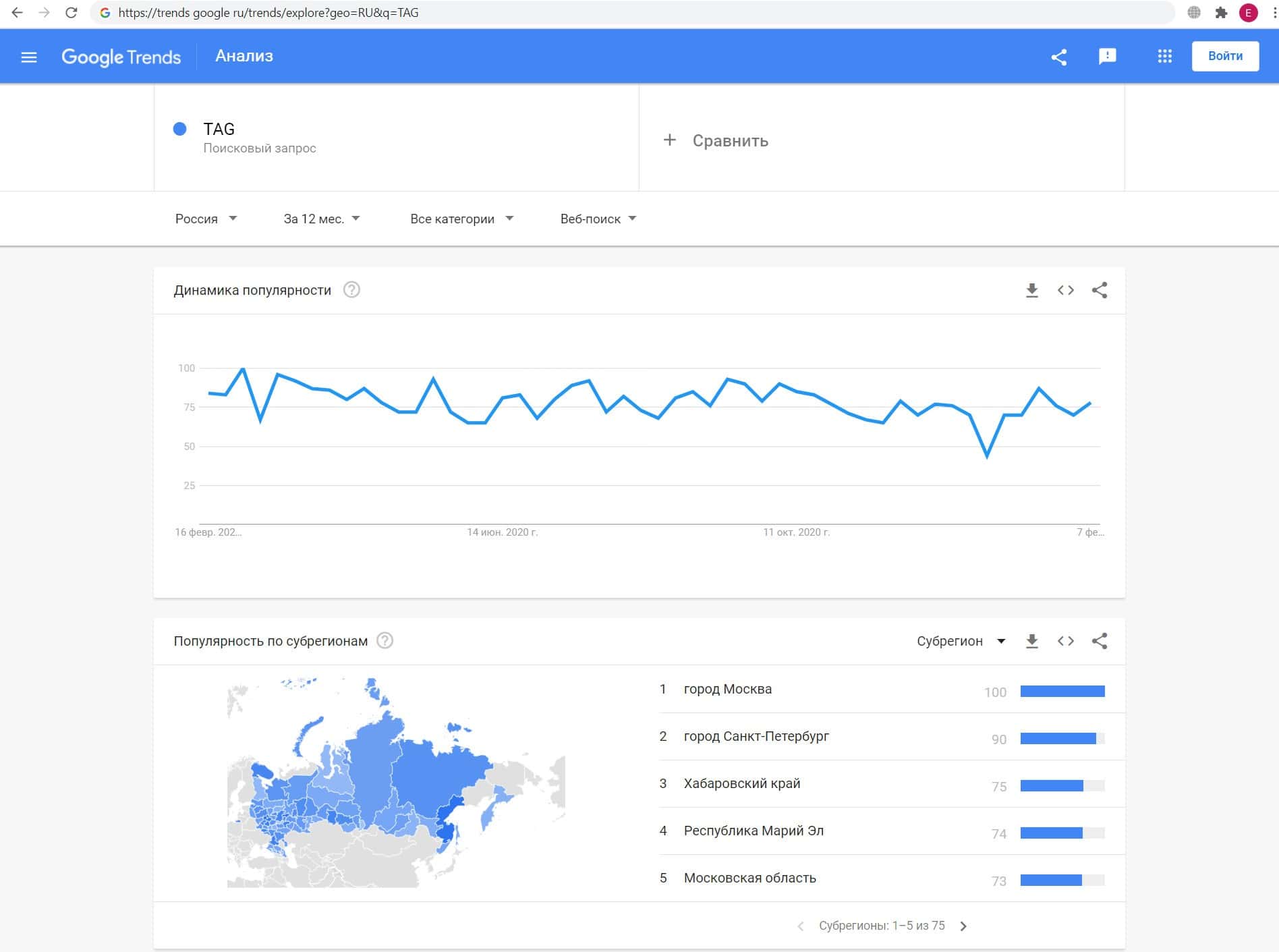 Ещё мы решили проверить количество запросов фирмы Т АГ по русскоязычному названию без пробела, а именно "ТАГ". Этот запрос пользователь совершили 61899 раз.