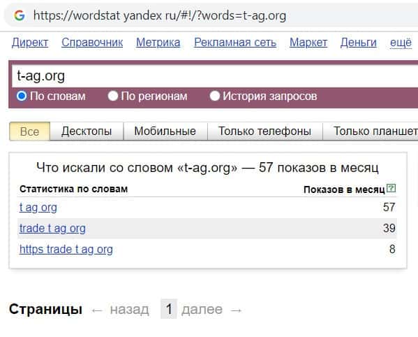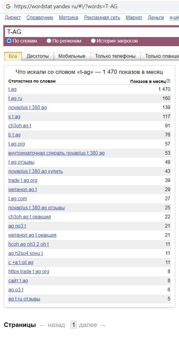 Мы проверили количество запросов мошенников T-AG Org в Яндексе по названию фирмы, а именно "T-AG". 1470 раз пользователи совершили данный запрос в течении месяца.