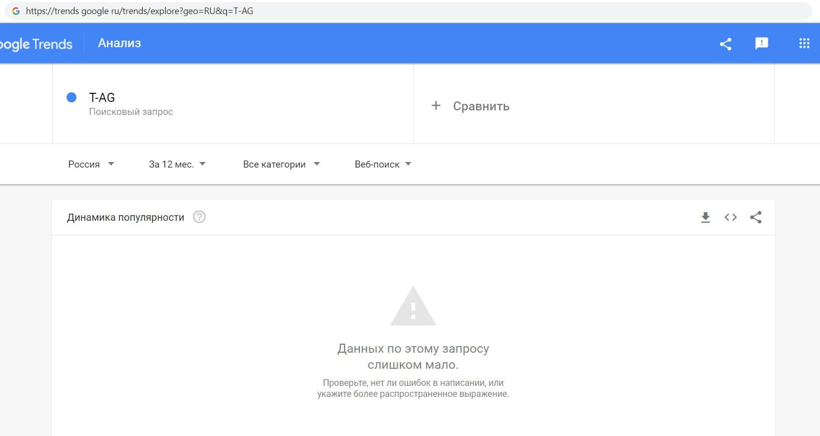 Мы проверили количество запросов компании финансовых кидал T-AG Org в Google по названию фирмы, а именно "T-AG", но данный запрос пользователи не выполняли целый год.