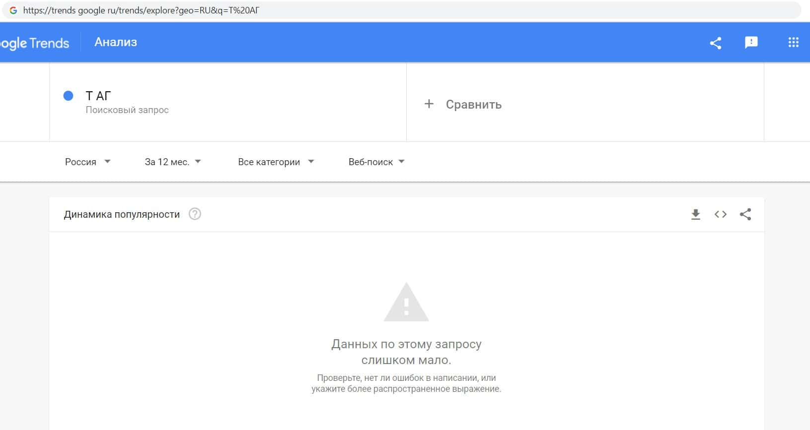Так же мы решили проверить количество запросов фирмы T-AG Org по русскоязычному названию, а именно "Т АГ". Данный запрос пользователи так же не выполняли весь год.