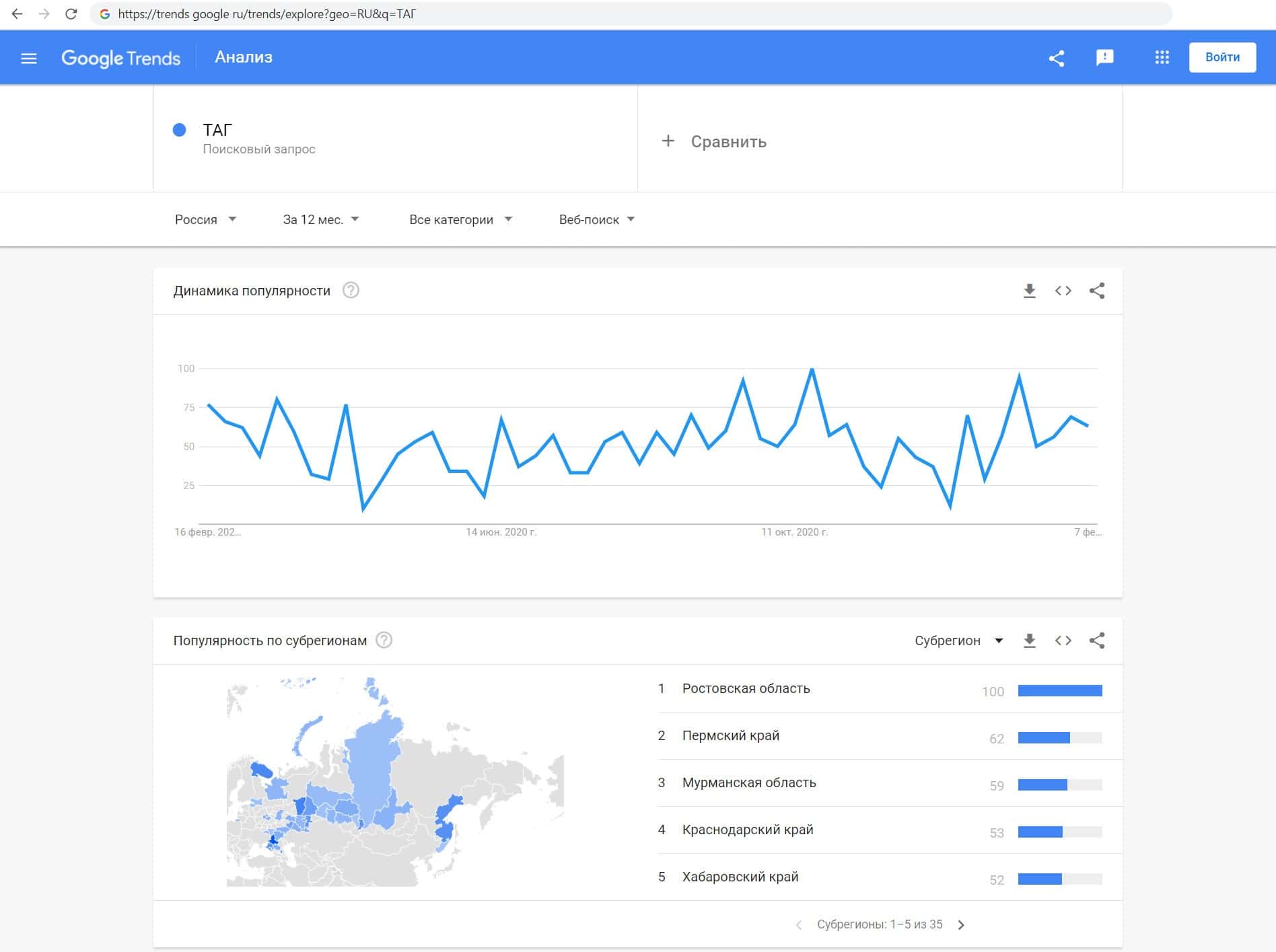 Ещё мы проверили количество запросов компании Т АГ по русскоязычному названию лохотрона без пробела, а именно "ТАГ". Этот запрос выполняли жители Ростовской области.