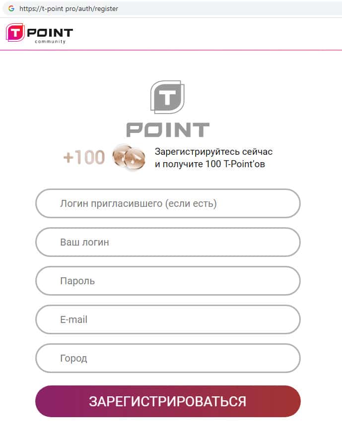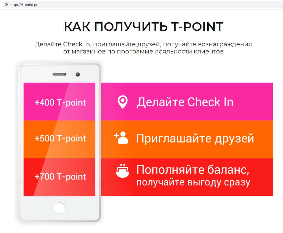 T-Point Pro - очередная хайп-контора, которая вешает лапшу на уши людям о том, что совершая покупки и пригласив в их контору своего друга якобы можно получить бонусы в виде вымышленных условных единиц под названием T-Point. Регистрироваться на фальшивом интернет-ресурсе конторы Т Поинт Про не рекомендуем !!!