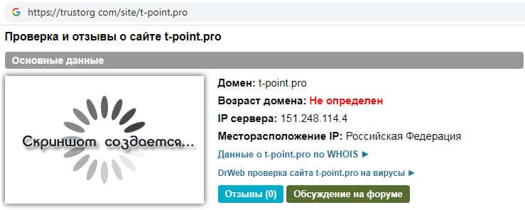 На информационном сайте trustorg com была произведена проверка ip-адреса мошеннической организации Т Поинт Про. Выяснилось, что определить возраст домена сайта оказалось невозможным. Доверять подобным непроверенным и не надежным аналогичным интернет-лохотронам не рекомендуем !!!