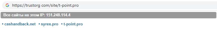 Так же при помощи проверки данной скам-организации на веб-сайте трусторг ком выяснилось, что T-Point Pro находится на одном ip-адресе с сайтами, деятельность которых не отличается от того, чем занимается данна контора. Из этого следует вывод о том, что с сайтом шараги Т Поинт Про вскоре может произойти тоже самое.