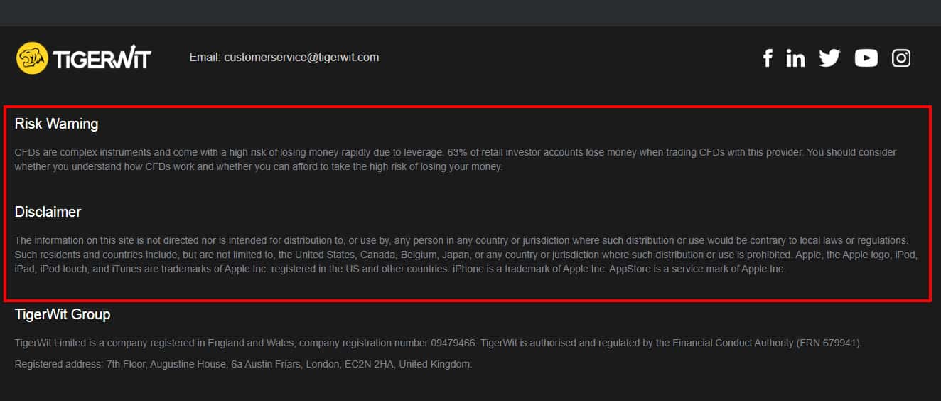 Завершается же подвальный сайт у мошенников TigerWit довольно стандартно и ожидаемо, а именно почтой аферистов Тайгер Вит, а так же ссылками на страницы жулья TigerWit в социальных сетях. Ну а далее у проходимцев TigerWit следует отказ от ответственности, а так же предупреждение о рисках, что вы можете наглядно увидеть на изображении ниже.