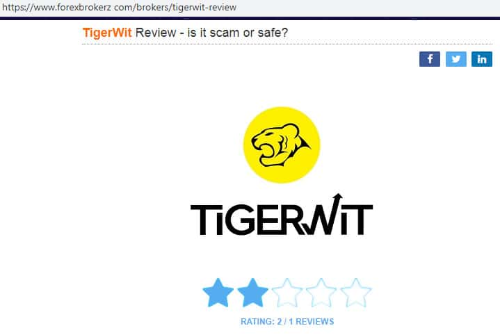 Ввиду крайне сомнительной мошеннической и противозаконной деятельности аферистов TigerWit множество источников относятся к проходимцам Тайгер Вит с сомнением. Исключением не стал и портал форексброкерз ком, который разместил информацию о лохотроне TigerWit на своем сайте. Однако рейтинг у жулья Тайгер Вит довольно низкий, что вы можете заметить ниже.
