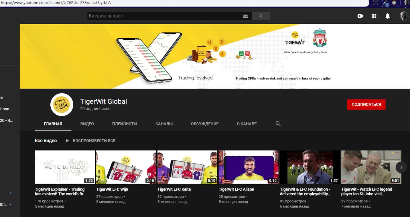 Для размещения различных мотивационных видеороликов с лапшой на уши наивной клиентуре аферисты TigerWit обзавелись страницей в социальной сети YouTube, где у мошенников Тайгер Вит имеется несколько десятков тысяч подписчиков. На изображении, расположенном ниже, вы можете увидеть страницу аферистов TigerWit с Ютубе.