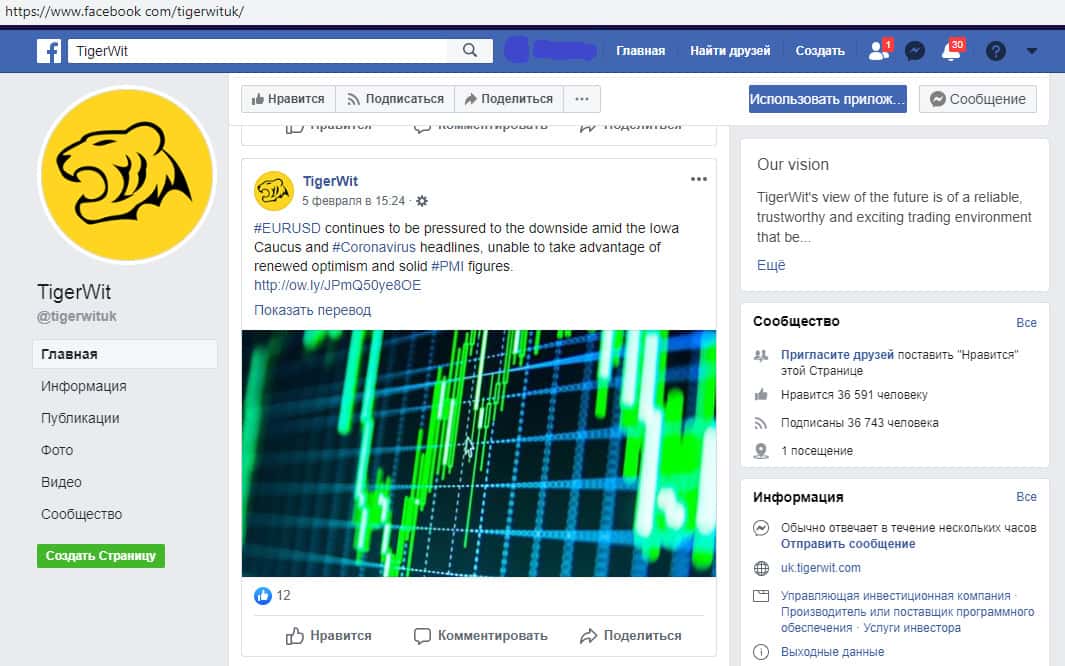 Дабы соответствовать современным трендам шулера TigerWit обзавелись страницами в социальных сетях одной из которых является Facebook, где у мошенников Тайгер Вит имеется несколько десятков тысяч подписчиков. На изображении, расположенном ниже, вы можете увидеть внешний вид страницы проходимцев TigerWit в социальной сети Фейсбук.