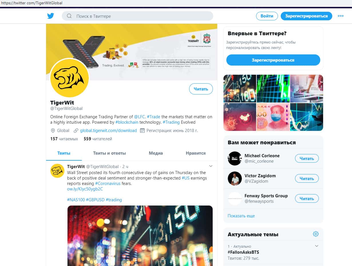 Имеется у проходимцев TigerWit и страница в социальной сети Твиттер, где у мошенников Тайгер Вит около пяти сотен подписчиков, что говорит о крайне низкой популярности аферистов TigerWit, или же их нежелании иметь дело с наивными пользователями. На изображении ниже вы можете наглядно увидеть страницу проходимцев TigerWit в Twitter.