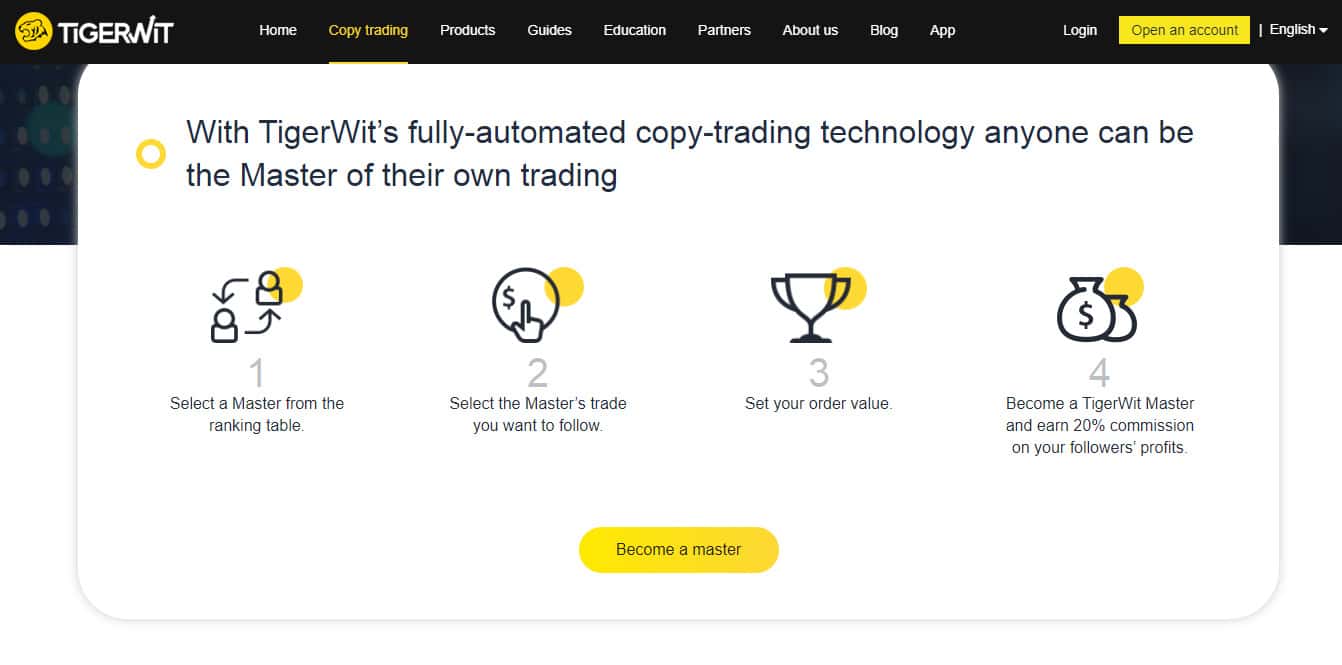 Помимо своего кухонного сайта мошенники Тайгер Вит ввели еще одну схему развода клиентуры путем так называемого копирования сделок, которое заключается в том, чтобы с аккаунта клиентуры повторялись все торговые операции неизвестного трейдера, которого рекомендует лохотрон TigerWit, но при этом не предоставляет гарантий.
