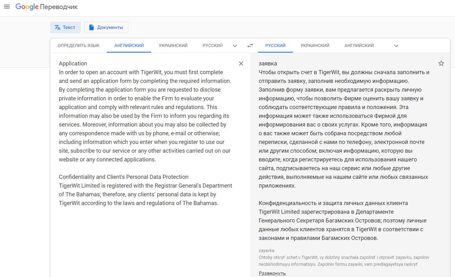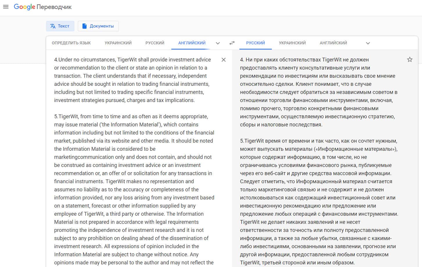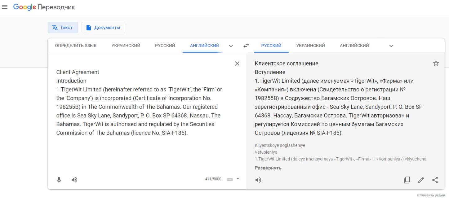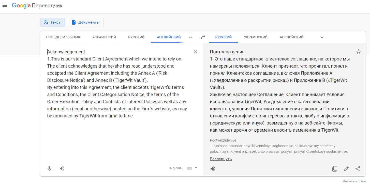 Перечень условий клиентского соглашения аферистов Тайгер Вит