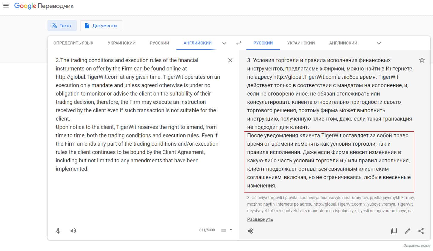 Имеется у проходимцев TigerWit и условие о том, что аферисты Тайгер Вит могут в любой момент по своему усмотрению без предварительного уведомления изменить свои условия сотрудничества, или же непосредственно условия торговли. При этом пользователь автоматически соглашается с данными изменениями условий сотрудничества от мошенников.