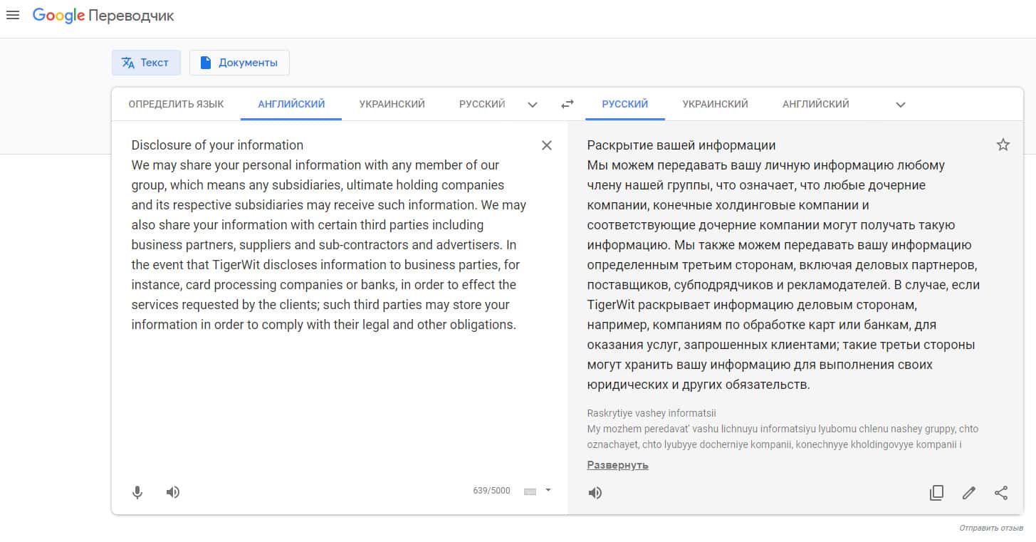 После в политике конфиденциальности у жуликов TigerWit следует условие уже о том, что шулера Тайгер Вит могут передавать личную и персональную информацию наивных пользователей третьим лицам. На изображении, расположенном ниже, вы можете наглядно увидеть данное условие в политике конфиденциальности аферистов.