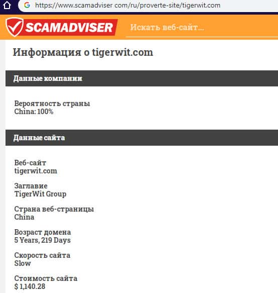 scamadviser com - сайт с технической информацией о лохотроне TigerWit