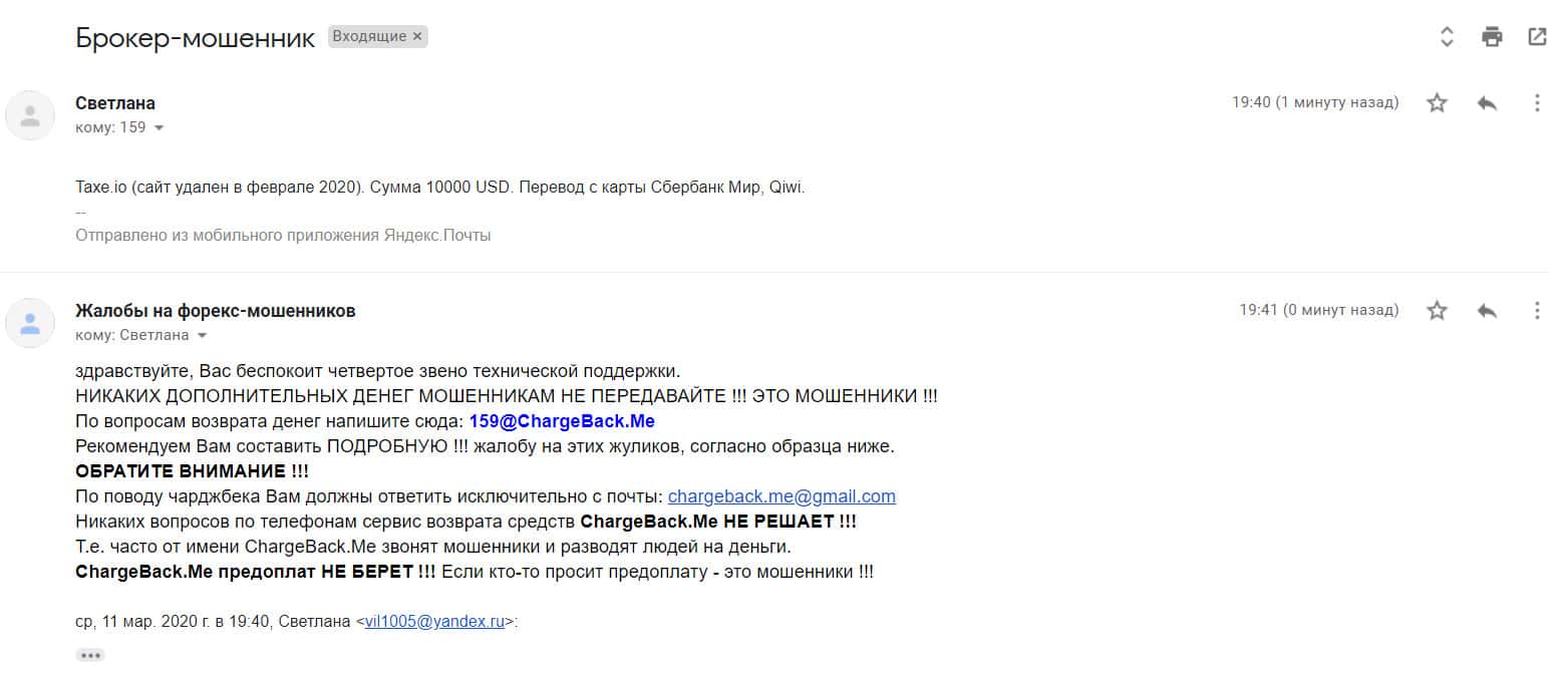 Обманутому трейдеру, потерявшему в псевдоброкерской компании Такс Ио свои деньги, через несколько дней пришло сообщение от, якобы, платежной системы, которая выразила готовность вернуть ему денежные средства, но для этого необходимо внести еще 10 процентов от заявленной суммы в криптовалюте. Обычная тактика лохотронного развода клиентов.