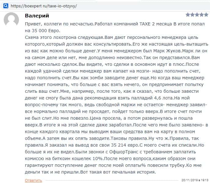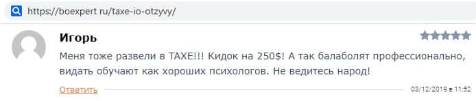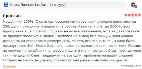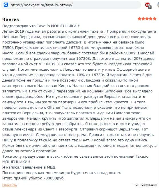 Очередной трейдер, обманутый мошенниками из Taxe Io, оставил жалобу на веб-ресурсе boexpert ru о потере денег
