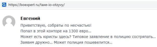 - Очередной трейдер, обманутый мошенниками из Taxe Io, оставил жалобу на веб-ресурсе boexpert ru о потере денег