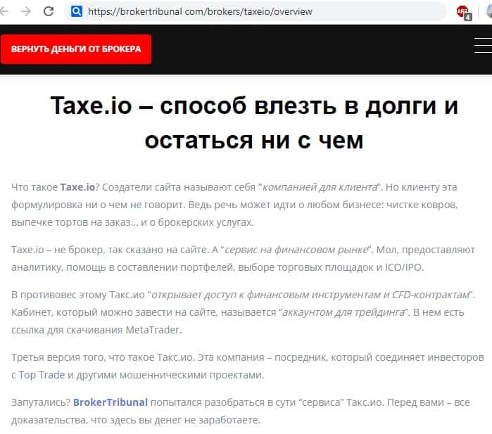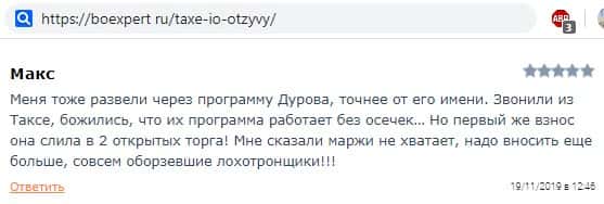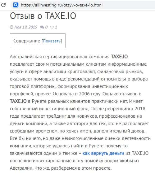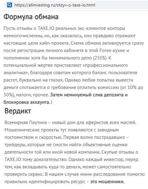 Профессиональный трейдер в своем отзыве о компании Taxe Io на информканале boexpert ru сообщает, что мошенники из этой конторы, обещая своим клиентам заработки на финансовых рынках, на самом деле присваивают их деньги. Также он говорит о недостоверности информации, размещаемой на ее официальном сайте, раскрывает мошеннические схемы развода трейдеров.