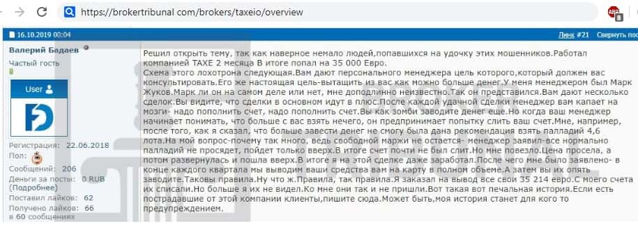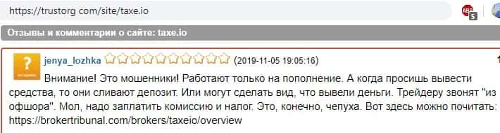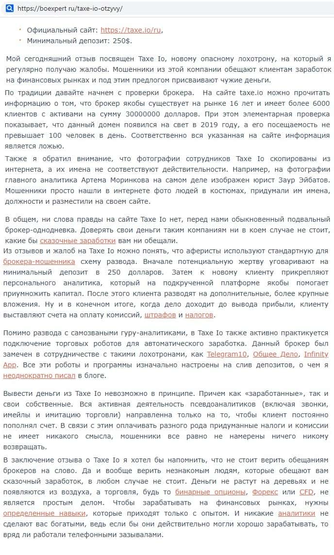 - Еще один несчастный трейдер жалуется своим коллегам на компанию Taxe Io на странице веб-портала boexpert ru