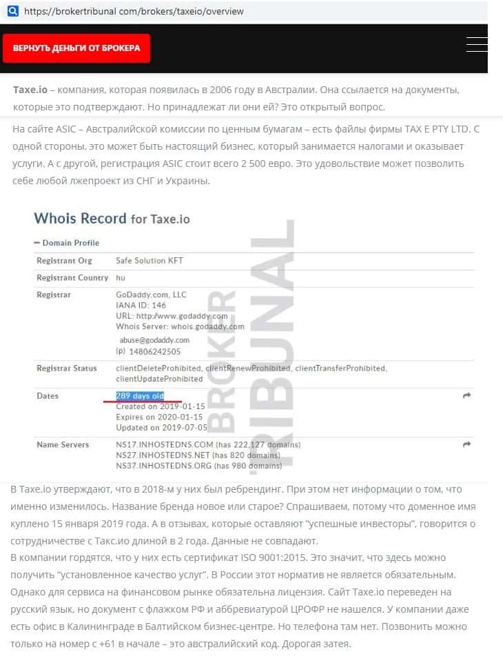 - Эксперты веб-ресурса brokertribunal com сомневаются в подлинности учредительных документов компании Taxe Io