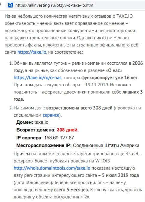 На страницах официального интернет-сайта компании Taxe Io специалистами allinvesting ru выявлено множество несоответствий в описании ресурса: намеренно увеличен возраст домена, на одном и том же айпи адресе сайта зарегистрировано еще множество интернет-ресурсов, уровень доверия у этого интернет-портала отрицательный - «–2».