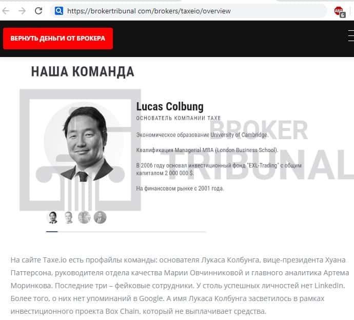Экономические эксперты с веб-ресурса brokertribunal com, проанализировав информацию с официального сайта компании Такс Ио об ее руководителях, пришли к мнению, что только одна из указанных персон - основатель компании – это реальное лицо, трое остальных - вице-президент, начальник отдела качества и главный аналитик - это фейковые сотрудники.