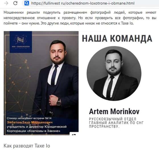 Экспертами информационно-аналитического интернет-портала fullinvest ru вскрыта фейковая информация на официальном сайте консалтинговой компании Такс Ио о ее руководителях, где вместо фотографий реальных лиц, причастных к ее деятельности, размещали фото случайных персон, взятые из Интернета.