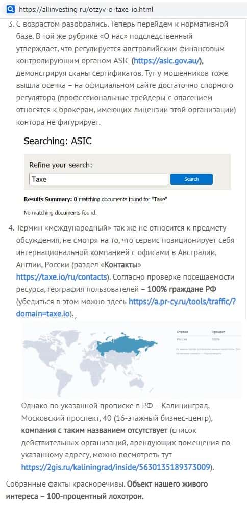 Эксперты веб-ресурса allinvesting ru выявили в своем обзоре факты публикации недостоверных данных о консалтинговой компании Taxe Io на ее официальном сайте: на веб-ресурсе австралийского финансового регулятора, где, якобы, зарегистрирована Такс Ио, эта контора не фигурирует, компания присваивает себе статус международной, при том, что география пользователей ограничивается исключительно Россией.