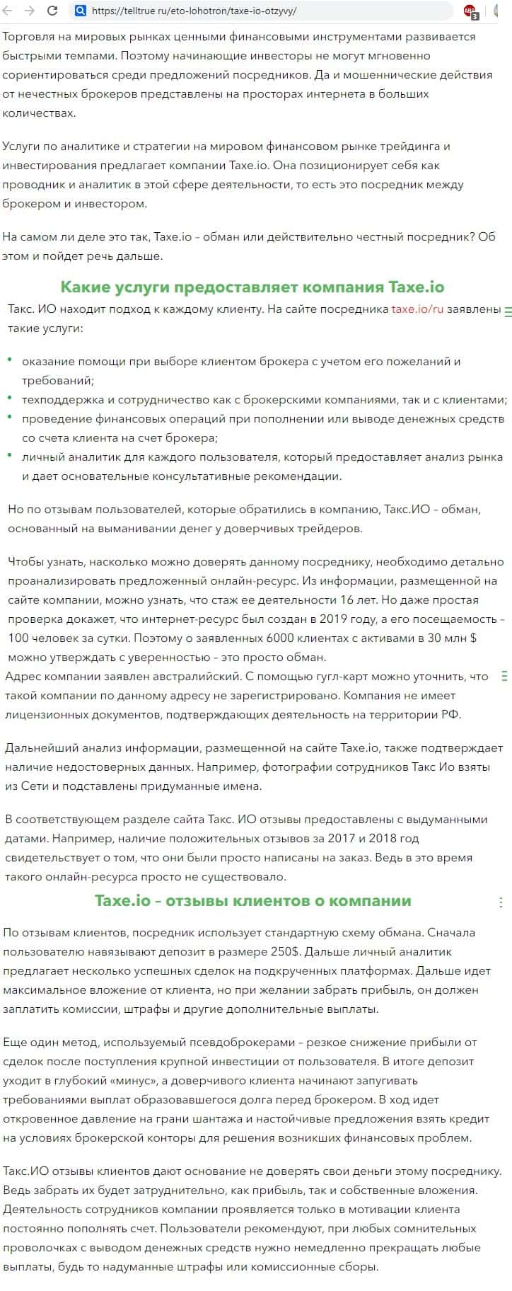 - На сайте telltrue ru считают, что деятельность Такс Ио - обман, основанный на выманивании денег у трейдеров