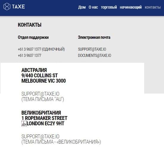 Контакты псевдоброкерской компании Такс Ио для связи с клиентами