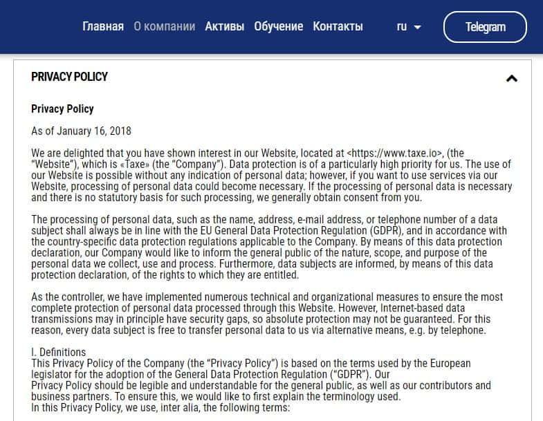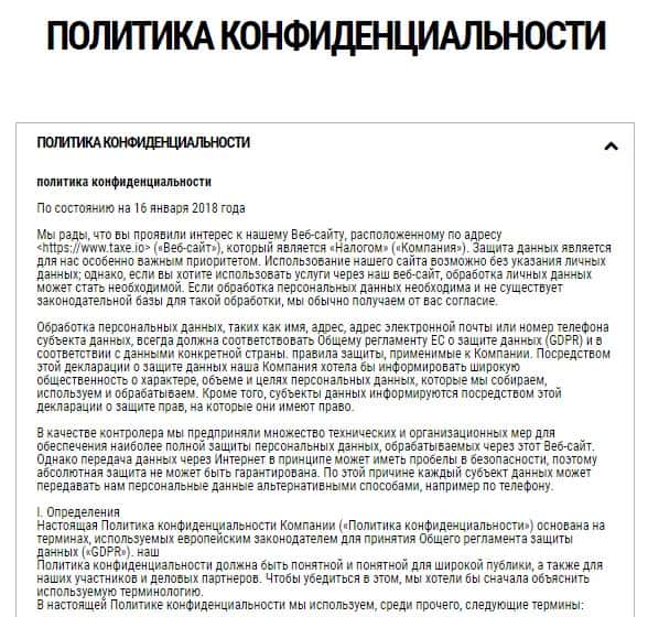 На сайте компании Taxe Io рамещена «Политика конфиденциальности», якобы призванная защищать персональные данные трейдеров, однако этот документ настолько объемный, что сделать с него полный скрин затруднительно. Одно можно сказать, что в нем ничего полезного нет, его текст стандартный, где компания практически не берет никаких обязанностей перед клиентами.