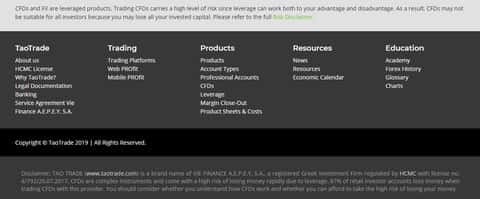 Завершается сайт у лохотрона Тао Трейд довольно стандартным окончанием сайта, которое состоит из ссылок на различные социальные сети, а так же предупреждение о рисках, в которых мошенники Tao Trade предупреждают наивных пользователей сети интернет о возможном риске потери всех средств, вложенных в помойку шулеров Тао Трейд.