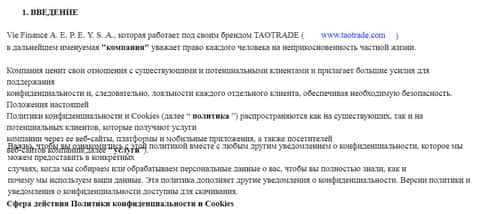 Политика конфиденциальности у мошенников Tao Trade начинается с типичной воды, в которой аферисты Тао Трейд описывают данный документ, его предназначение и тому подобное, что так же сделано с целью его увеличения. На изображении, расположенном ниже, вы можете увидеть начало политики конфиденциальности лохотрона Tao Trade.