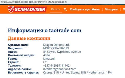 В связи с мошеннической и противозаконной деятельностью мошенников Tao Trade его реальные руководители предпочитают анонимность дабы избежать ответственности со стороны правоохранительных органов. Информацию о самом же сайте лохотрона Тао Трейд можно узнать с помощью портала scamadviser com, которую вы можете увидеть на изображении ниже.