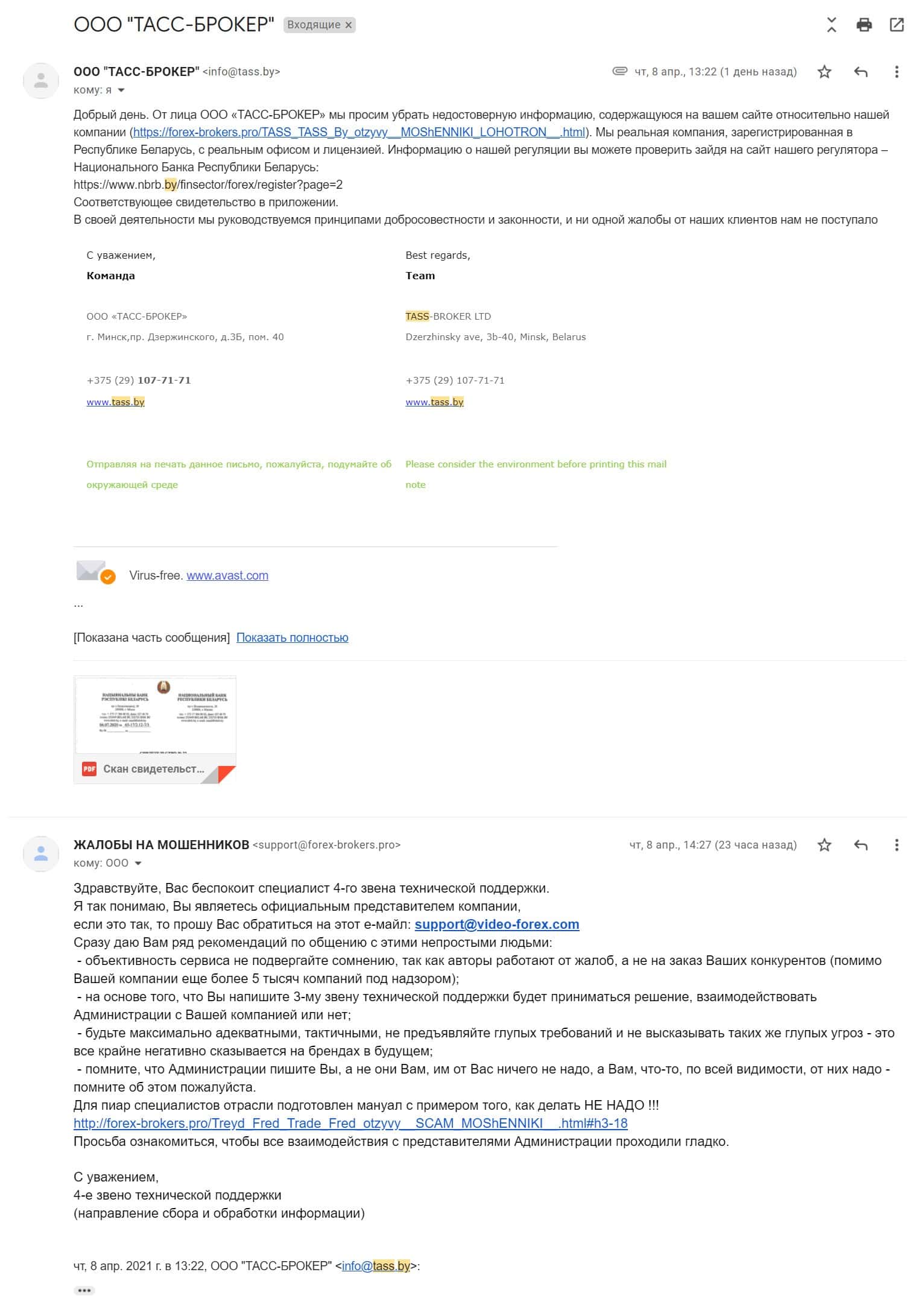 Далее мы размещаем причину, по которой, по мнению мошенников ТАСС Брокер, про них мошенников нельзя писать, что они мошенники. Мошенники прислали бумажку с подписью какого-то чиновника из картофельного центрального банка, где сказано, что мошенники ТАСС Брокер - это нормальные ребята. Скрин этой "индульгенции" публикуем ниже.