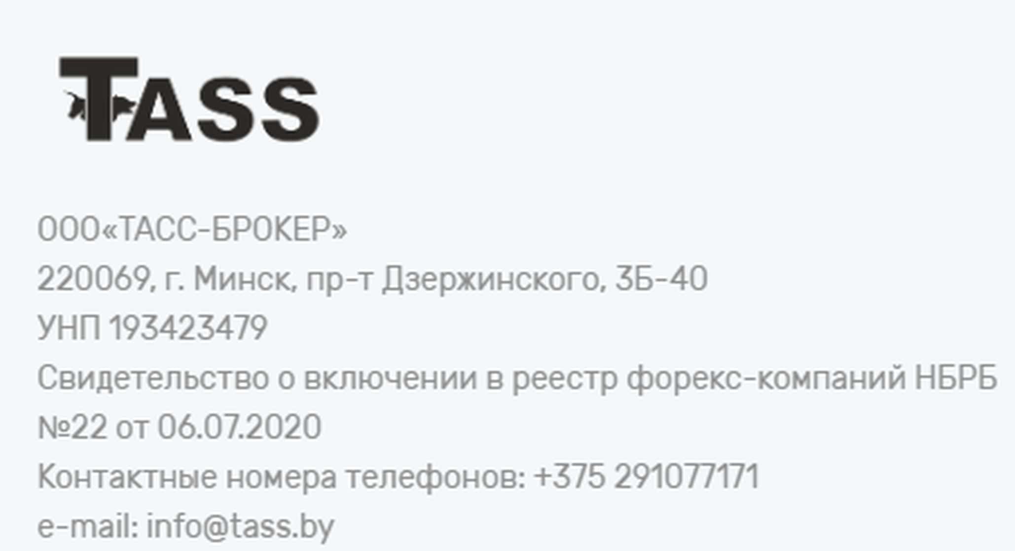 Мошенники TASS By на своем сайте указывают, что якобы действуют под прикрытием некоего юридического лица ООО «ТАСС-БРОКЕР», которое зарегистрировано в Белоруссии.
