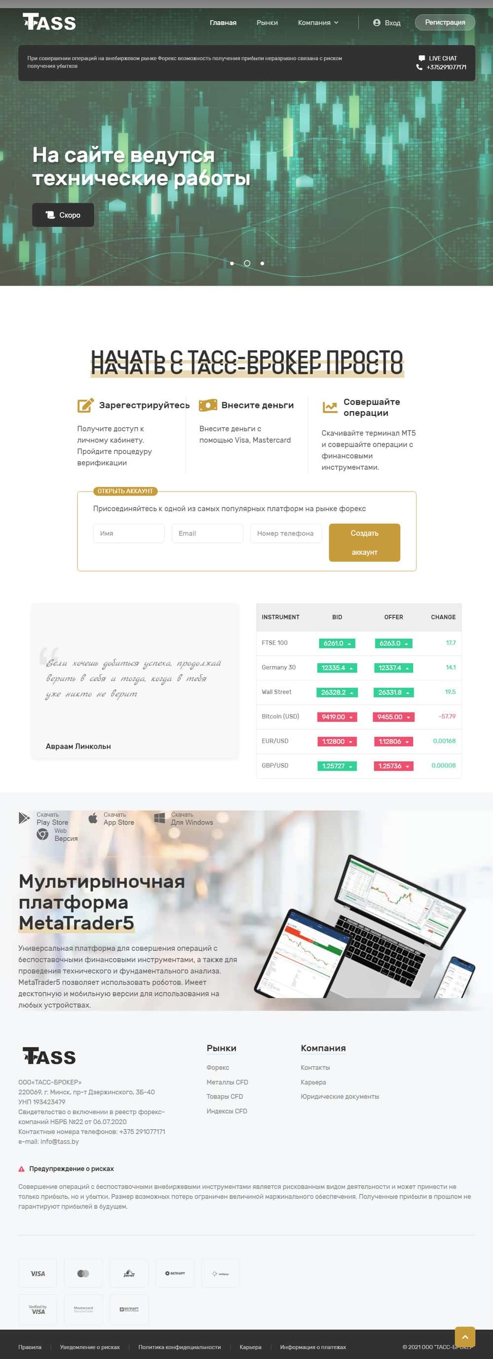 ТАСС - это аферисты и обманщики! Очередная конторка, которая находится, не пойми где, представляется брокером, не являясь таковым. Они используют платформу Мета Трейдер 5, которую создали IT-жулики MetaQuotes, чтобы обманывать трейдеров. Выводите срочно деньги, если получится из недопроекта TASS By и держитесь от этих шарлатанов подальше!