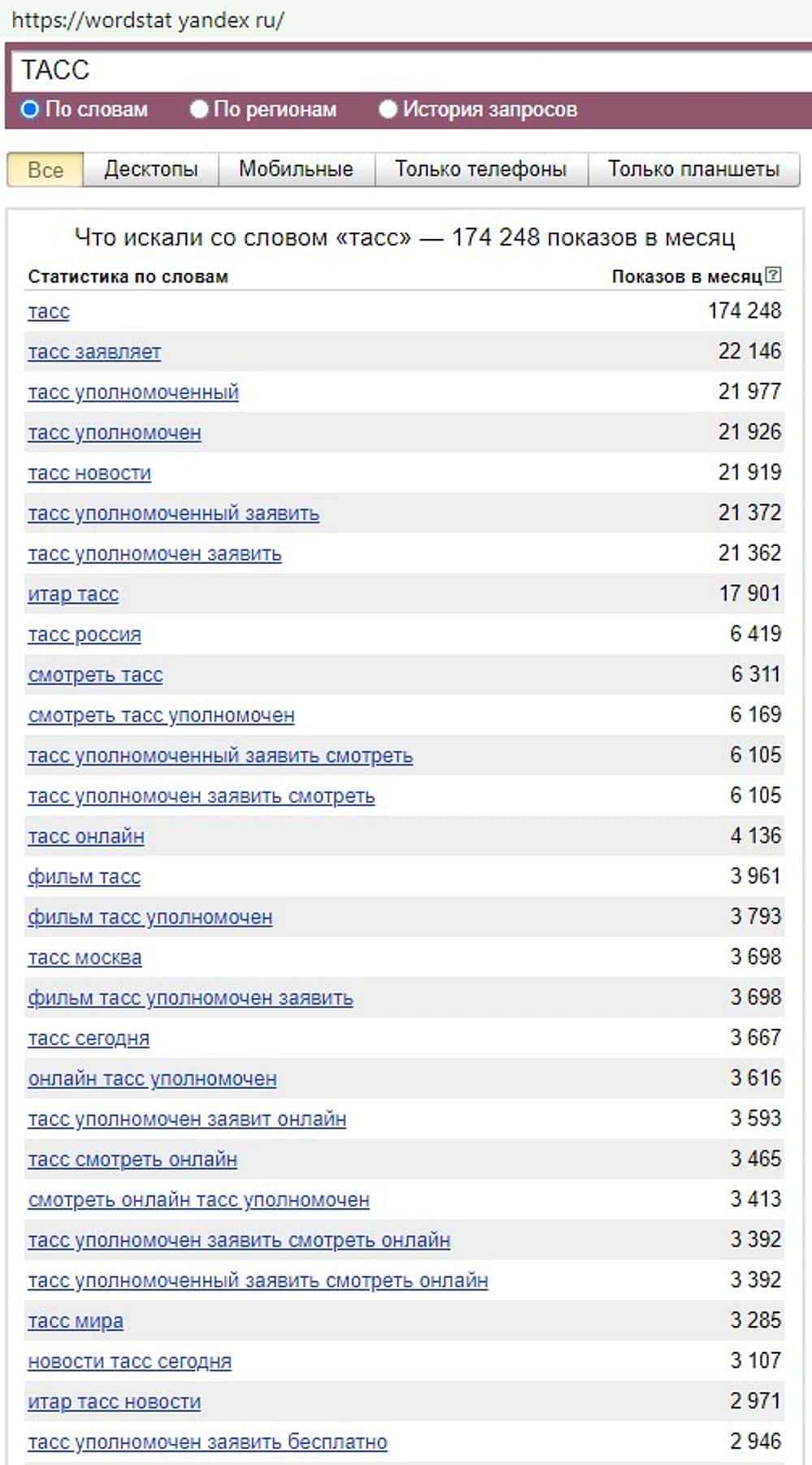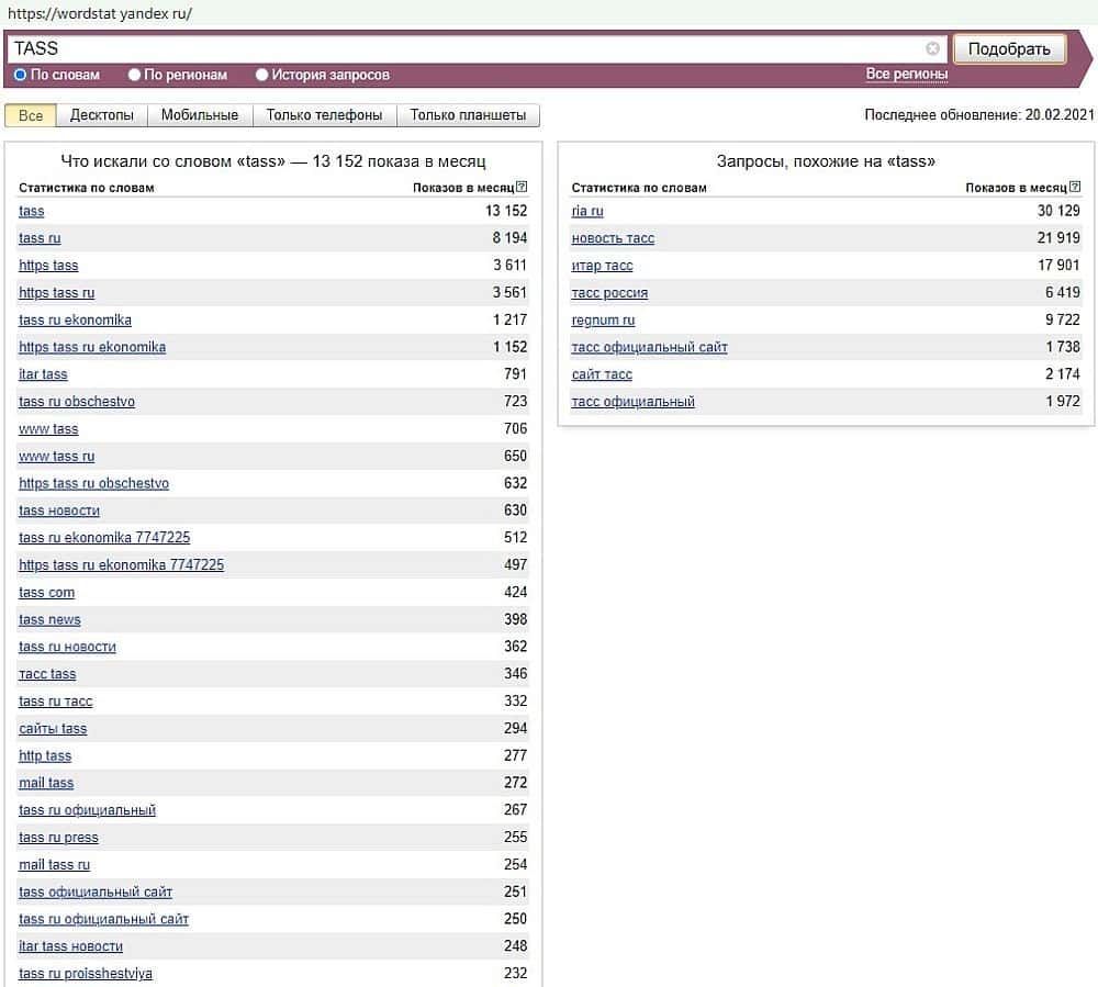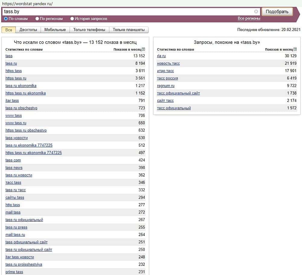 - Как часто авантюристов TASS By ищут с помощью Яндекса?