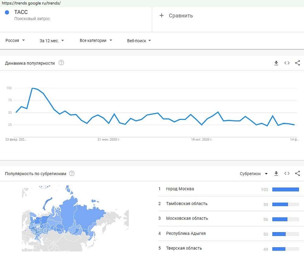 Ту же картину можно наблюдать и в отношении поискового запроса "ТАСС". Этим брендом интересовались пользователи Гугл, однако не факт, что искали эту брокерскую недокухню.
