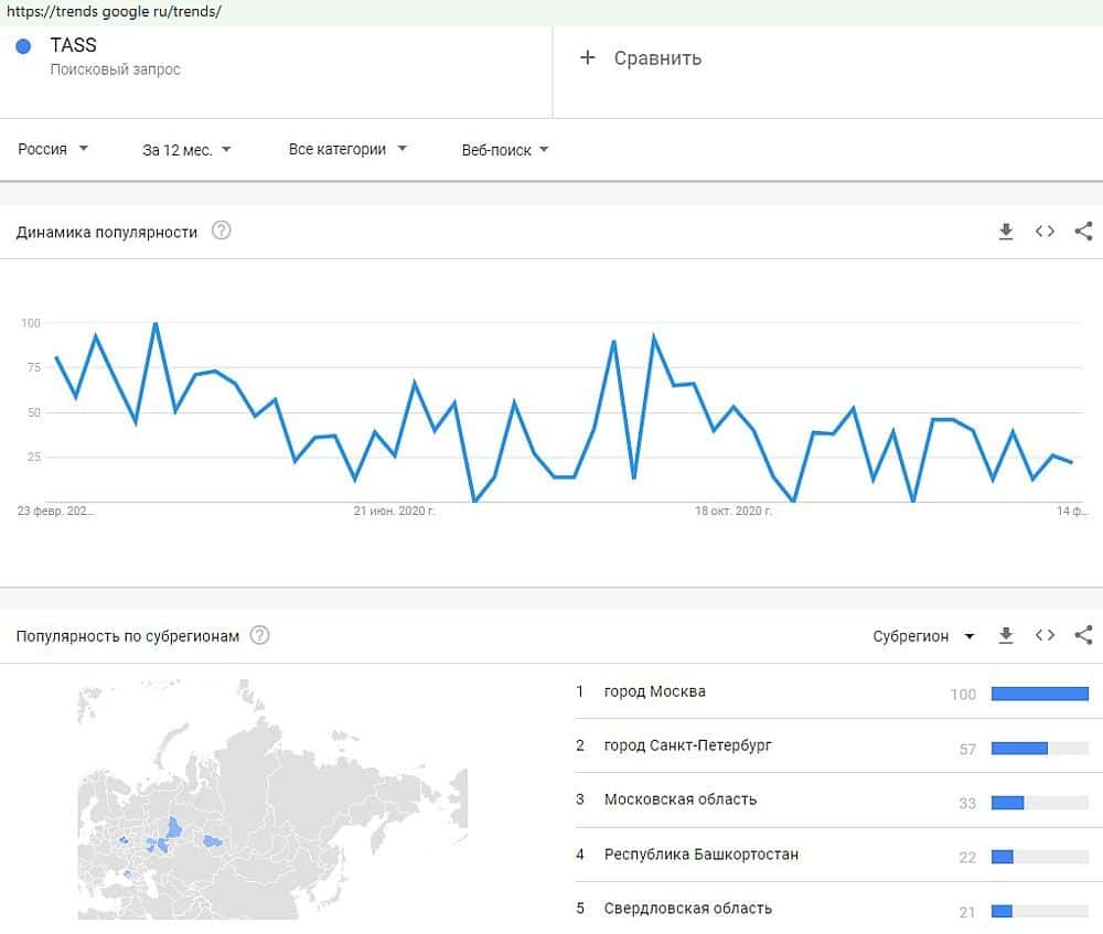 С поисковым запросом "TASS" ситуация несколько иная. Мы можем наблюдать динамику популярности данного запроса, однако со 100% уверенности, можно сказать - искали не жулье.
