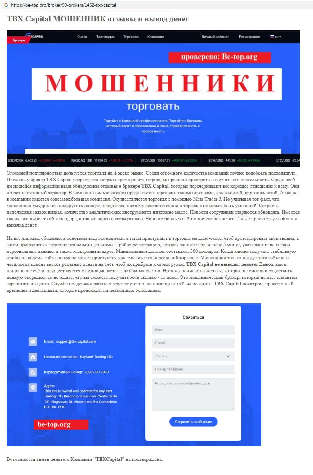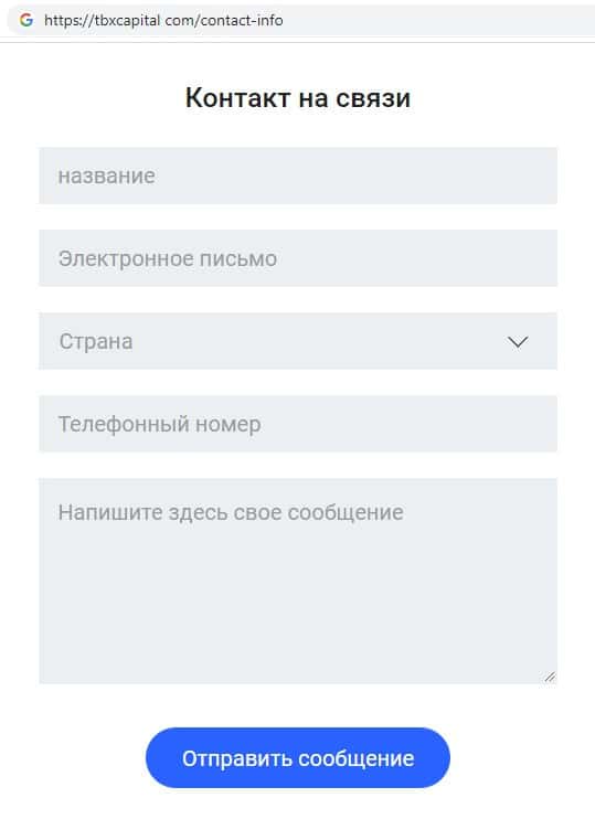 - Контактная информация на сайте жульнической организации TBX Capital