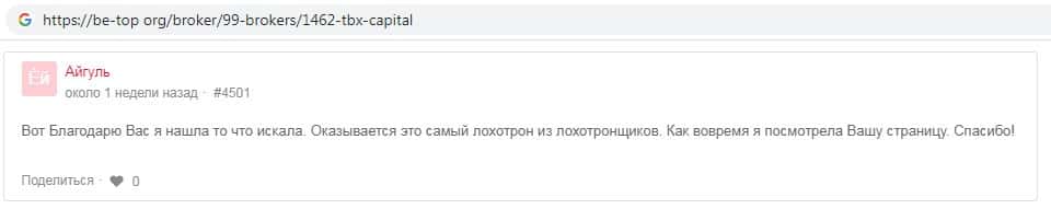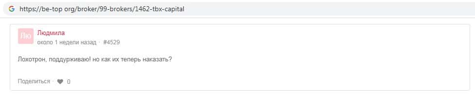 Далее предлагаем ознакомиться с пользовательскими отзывами о том, что скам-брокер TBXCapital на самом деле является интернет-лохотроном.